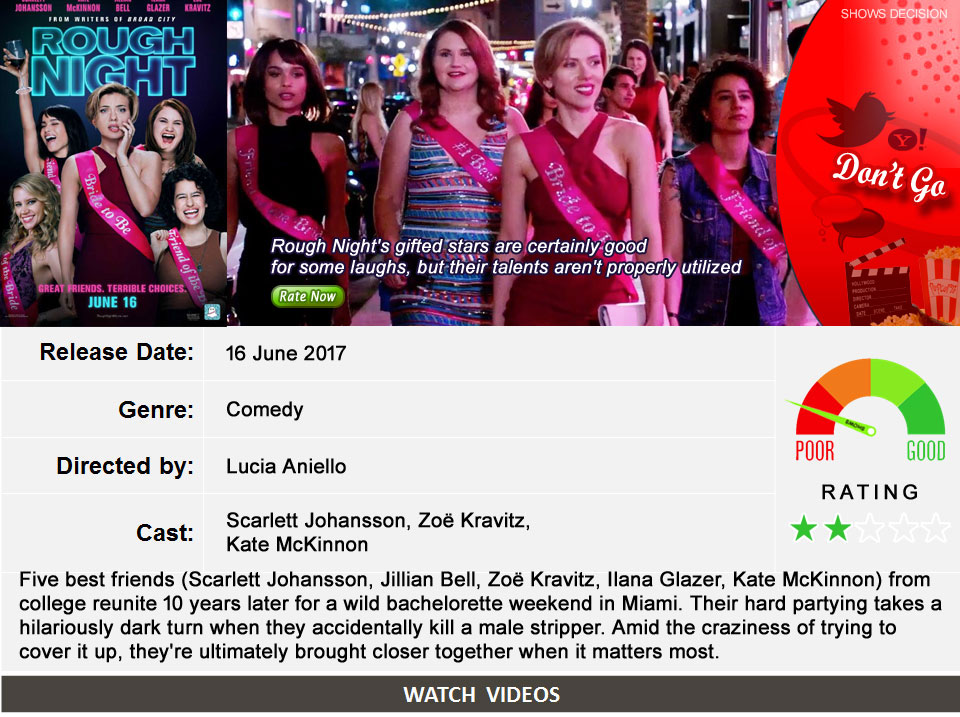 Rough Night What’s your Reaction? +1 0 +1 0 +1 0 +1 0 +1 0 Facebook Twitter Email Five best friends (Scarlett Johansson, Jillian Bell, Zoë Kravitz, Ilana Glazer, Kate McKinnon) from college reunite 10 years later for a wild bachelorette weekend in Miami. Their hard partying takes a hilariously dark turn when they accidentally kill a male stripper. Amid the craziness of trying to cover it up, they’re ultimately brought closer together when it matters most. [instagram-feed id=”3432269187″ showheader=”false” ]
