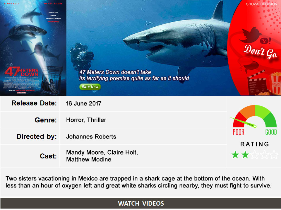47 meters down What’s your Reaction? +1 0 +1 0 +1 0 +1 0 +1 0 Facebook Twitter Email Young sisters Kate and Lisa and travel to Mexico for a vacation filled with sun, fun and adventure. Lisa needs some extra persuasion when Kate suggests that they go diving in shark-infested waters. Safe in their protective cage, the thrill-seeking siblings come face to face with a group of majestic great whites. Their worst fears soon become a reality when the cage breaks away from their boat, sending them plummeting to the ocean floor with a dwindling supply of oxygen. [instagram-feed id=”258480860″ showheader=”false” ]