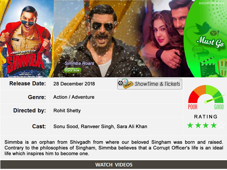 Simmba What’s your Reaction? +1 0 +1 0 +1 0 +1 0 +1 0 Facebook Twitter Email Simmba is an upcoming Indian Hindi-language action film directed by Rohit Shetty and written by Yunus Sajawal and Sajid-Farhad. A spin-off of the Singham franchise, the film was produced by Karan Johar under the banner of Dharma Productions.[1] It stars Ranveer Singh, Sara Ali Khan and Sonu Sood, with Ajay Devgn reprising his role of Bajirao Singham. @RanveerSingh Tweets by SimmbaTheFilm