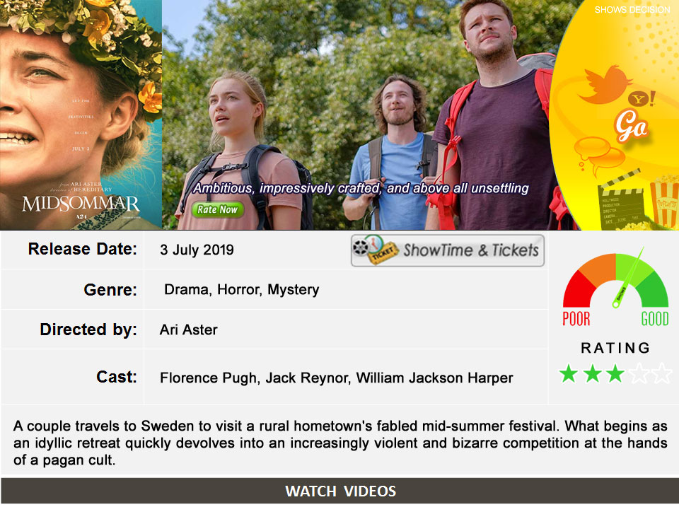 Midsommar What’s your Reaction? +1 0 +1 0 +1 0 +1 0 +1 0 Facebook Twitter Email A couple travels to Sweden to visit a rural hometown’s fabled mid-summer festival. What begins as an idyllic retreat quickly devolves into an increasingly violent and bizarre competition at the hands of a pagan cult. @midsommarmovie Tweet #midsommar