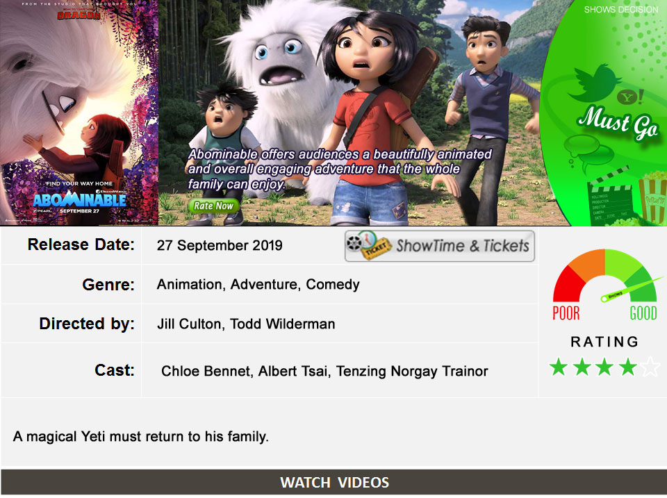 Abominable What’s your Reaction? +1 0 +1 0 +1 0 +1 0 +1 0 Facebook Twitter Email Abominable is a 2019 computer-animated adventure film produced by DreamWorks Animation and Pearl Studio. It was written and directed by Jill Culton and co-directed by Todd Wilderman, and stars the voices of Chloe Bennet, Albert Tsai, Tenzing Norgay Trainor, Eddie Izzard, Sarah Paulson, Tsai Chin, and Michelle Wong. Tweets by Chloe Bennet