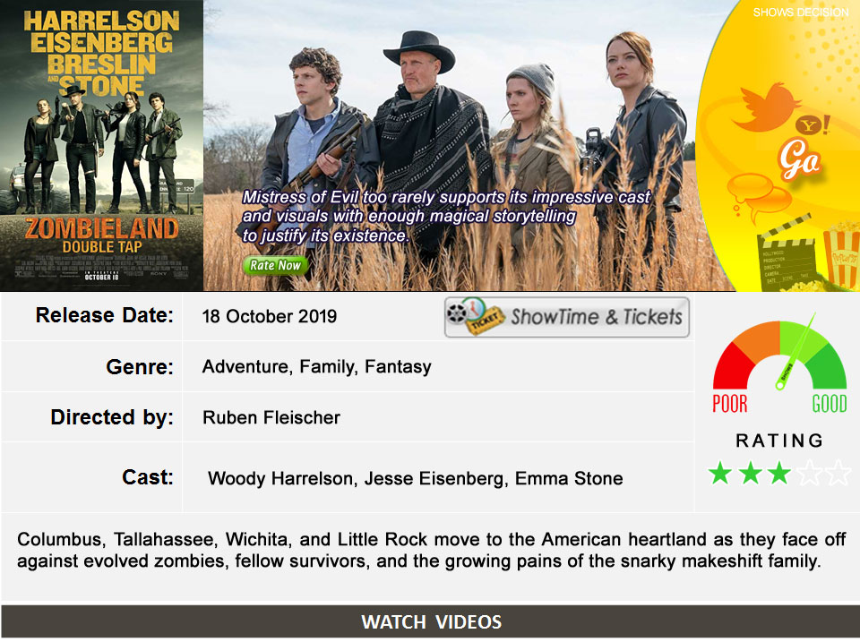 Zombieland: Double Tap What’s your Reaction? +1 0 +1 0 +1 0 +1 0 +1 0 Facebook Twitter Email Columbus, Tallahassee, Wichita, and Little Rock move to the American heartland as they face off against evolved zombies, fellow survivors, and the growing pains of the snarky makeshift family. Tweets by Zombieland Style to wear