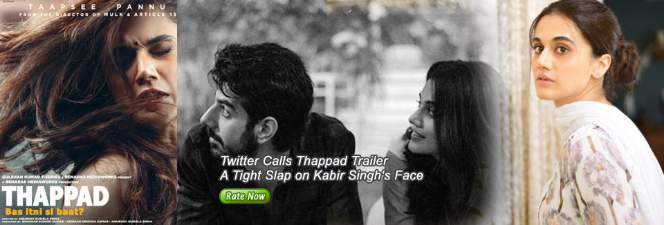 Twitter Calls Thappad Trailer A Tight Slap on Kabir Singh's Face What’s your Reaction? +1 0 +1 0 +1 0 +1 0 +1 0 Facebook Twitter Email Thappad, directed by Anubhav Sinha, features Taapsee Pannu in the lead role. The film is about violence in a relationship. The trailer of filmmaker Anubhav Sinhas upcoming movie Thappad is out now, and netizens couldn’t help but call it a “tight slap” on Kabir Singh director Sandeep Reddy Vanga’s face. After the slap scene in his blockbuster film Kabir Singh became talk of the town, Vanga had said: “When you are deeply in love and deeply connected with a woman, and vice versa, there’s a lot of honesty in it. If you don’t have that physical demonstration… you don’t have the liberty of slapping each other, then I don’t see anything there.” His comments didn’t go down well with a lot of people. That was last year but netizens got reminded of the whole controversy after watching the trailer of Thappad. Videos Tweets by taapsee Style to wear