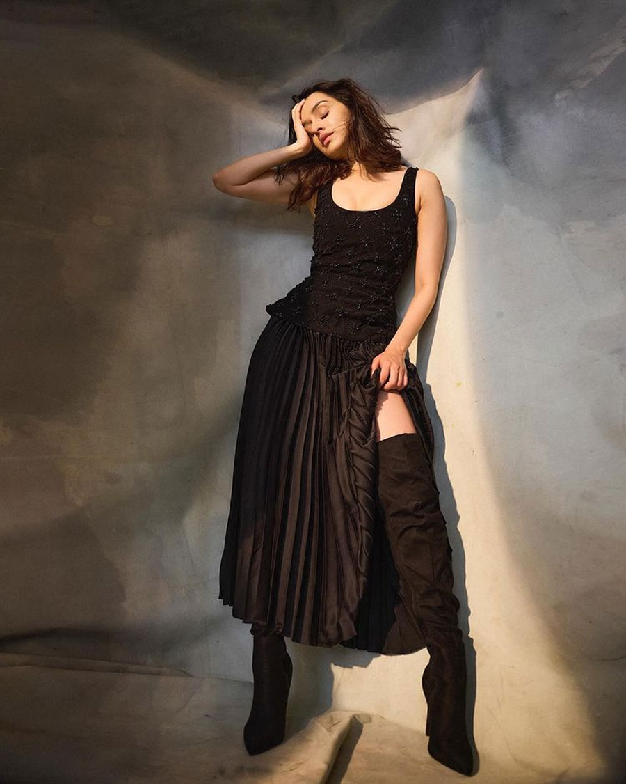Sexy! Shraddha Kapoor Sizzles In An All Black Ensemble Flaunting Her Curves What’s your Reaction? +1 0 +1 0 +1 0 +1 0 +1 0 Facebook Twitter Email Shraddha Kapoor has an impeccable sense of style. Apart from films, the actress also has a noteworthy approach to fashion and often makes heads turn. Recently, she shared a bundle of ravishing clicks from her latest photoshoot, which instantly went viral. The Stree actress looked drop-dead gorgeous, donning an all-black ensemble. Shraddha found the right balance between elegance and charm as she struck her poses with utmost perfection. She wore a shimmery sleeveless black top, paired elegantly with a flared black skirt. The ensemble was completed with a pair of thigh-high boots, tying her whole look together. Minimal makeup, with perfectly done eyeliner, made her appear radiant in every way. Sharing the photos, she added a humorous caption: “Hassi hassi mein poora Saturday Insta pe nikal gaya na??? “.Fans flooded the comments section, and actress Samantha Ruth Prabhu also gushed over her looks, writing, ‘Love♥️♥️♥️.’ Related Videos Tweets by ShraddhaKapoor