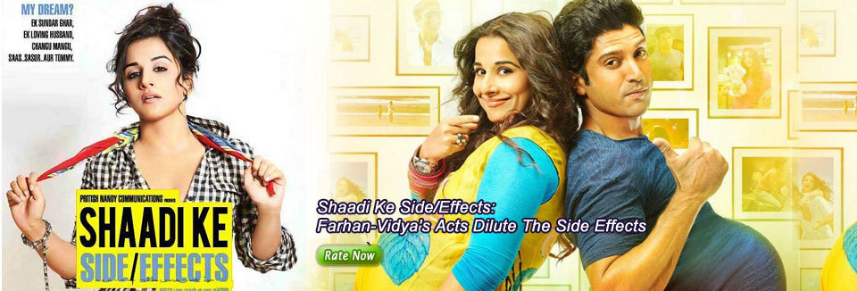 Shaadi Ke Side Effects What’s your Reaction? +1 0 +1 0 +1 0 +1 0 +1 0 Facebook Twitter Email A sequel to 2006 rom-com `Pyaar Ke Side Effects` takes the viewers a step ahead with Shaadi Ke Side Effects. Revolving around the pros and cons of marriage, the film starring Farhan Akhtar and Vidya Balan is a laugh riot. var s1 = new SWFObject(‘http://www.youtubereloaded.com/embed/player.swf’,’ply’,’400′,’470′,’9′,’#’); s1.addParam(‘allowfullscreen’,’true’); s1.addParam(‘allowscriptaccess’,’always’); s1.addParam(‘wmode’,’opaque’); s1.addParam(‘flashvars’,’file=http%3A%2F%2Fgdata.youtube.com%2Ffeeds%2Fapi%2Fvideos%3Fvq%3DShaadi+Ke+Side+Effects%26max-results%3D10&playlist=bottom&frontcolor=cccccc&lightcolor=66cc00&skin=http://www.youtubereloaded.com/embed/skin1.swf&backcolor=111111&playlistsize=200&autostart=true’); s1.write(‘YouTubeReloadedPlayer’); Release Date: 28 February 2014 Genre: Comedy, Drma Directed by: Saket Chaudhary Cast:Farhan Akhtar, Vidya Balan, Vir Das, Ram Kapoor, Gautami Kapoor , Ila Arun, Hariharane Shows [rating:3.5] Shows Movie Decision: … 65% Positive based on 7000 tweets … Yahoo Critics – Grade – ☢Home » Uncategorized » ⤍ More