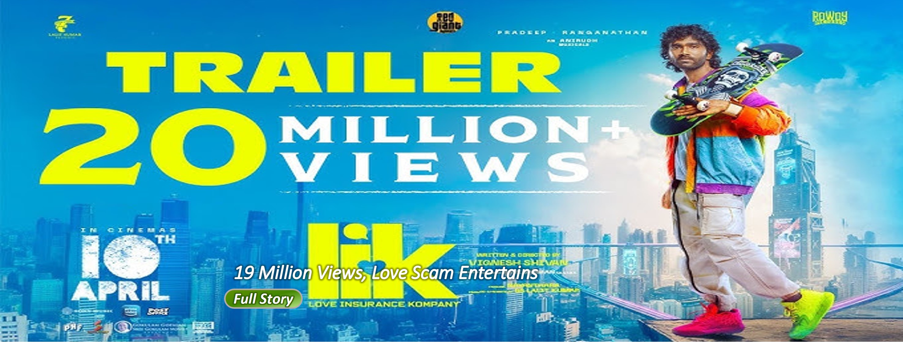 19 Million Views, Love Scam Entertains What’s your Reaction? +1 0 +1 0 +1 0 +1 0 +1 0 Facebook Twitter Email The trailer of Love Insurance Kompany has already crossed an impressive 19,379,168 views in just four days, signaling strong audience curiosity and buzz. It teases a quirky mix of romance, comedy, and clever deception centered around insurance fraud. The visuals are colorful and energetic, while the lead character’s charm adds to the appeal. Humor blends smoothly with moments of tension, hinting at deeper emotional stakes. The background score enhances the playful yet suspenseful tone. Overall, the trailer’s massive view count reflects its engaging content and promises a fun, twist-filled entertainer ahead.(Source) Related Videos Tweets by pradeeponelife