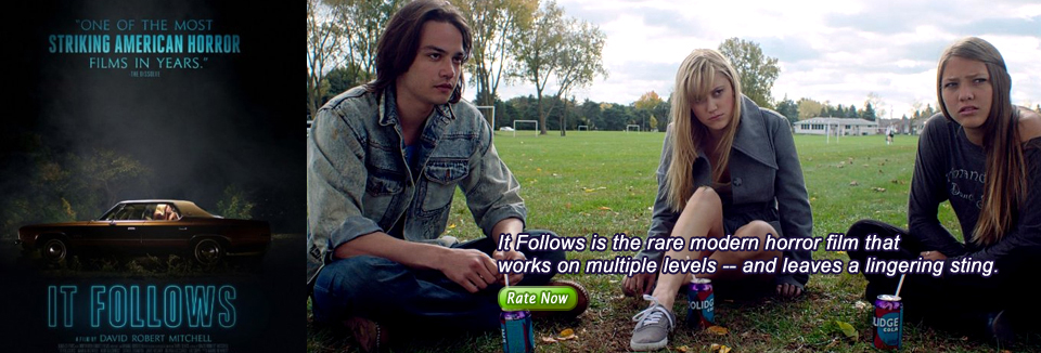 It Follows What’s your Reaction? +1 0 +1 0 +1 0 +1 0 +1 0 Facebook Twitter Email A young woman is followed by an unknown supernatural force after getting involved in a sexual confrontation. Release Date: March 27th, 2015 Genre: Horror Directed by: David Robert Mitchell Cast: Maika Monroe, Keir Gilchrist, Olivia Luccardi Shows [rating:4.0] … 74% Positive based on 7000 tweets … Rotten Tomatoes – Score – 74%